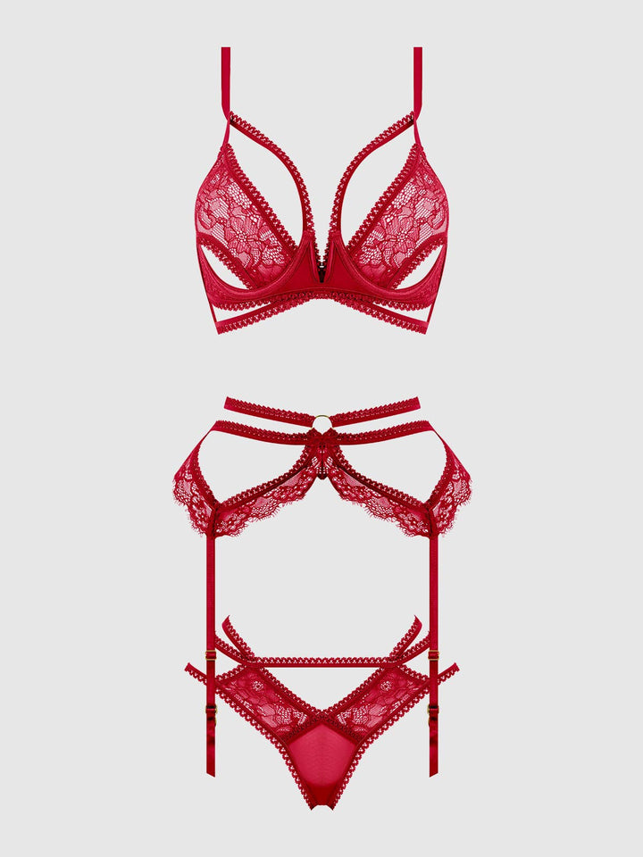 BIANCA STRAPPY LACE BRA, GARTER & HIPSTER SET: PERSIAN RED / XL
